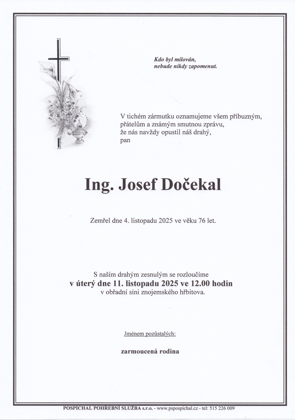 Rádi bychom touto cestou poděkovali všem, kdo jste se přišli rozloučit s panem Ing. Josefem Dočekalem.