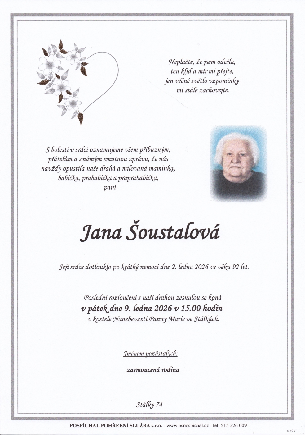 Rádi bychom poděkovali všem, kdo jste se přišli naposledy rozloučit s paní Janou Šoustalovou.