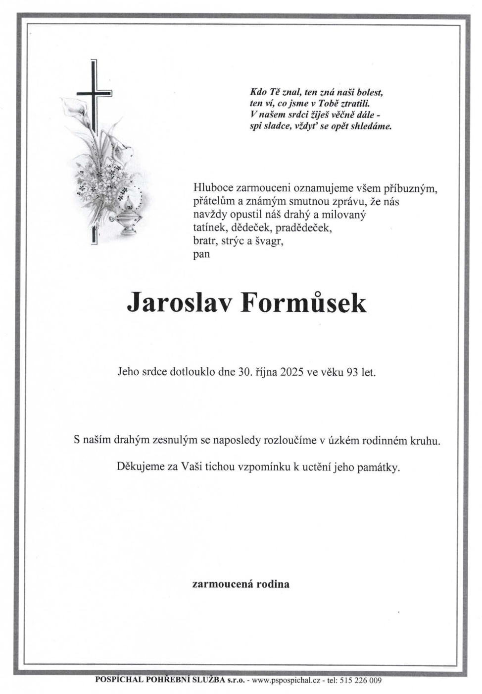 Děkujeme všem, kdo jste tichou vzpomínkou uctili památku pana Jaroslava Formůska.