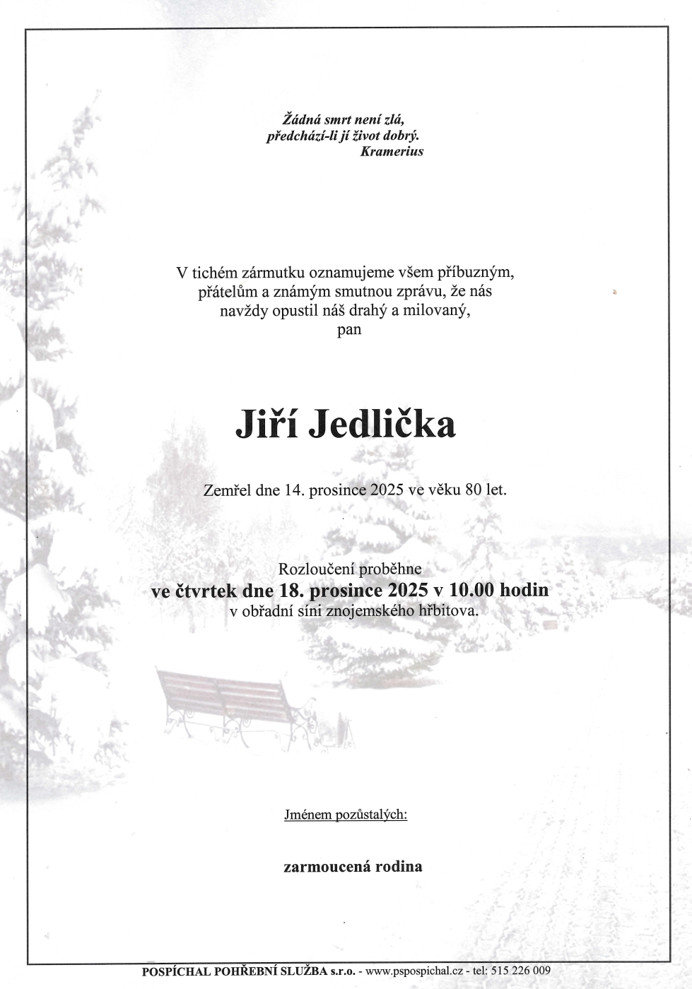 Děkujeme všem příbuzným, přátelům a známým, kteří se přišli naposledy rozloučit s panem Jiřím Jedličkou.