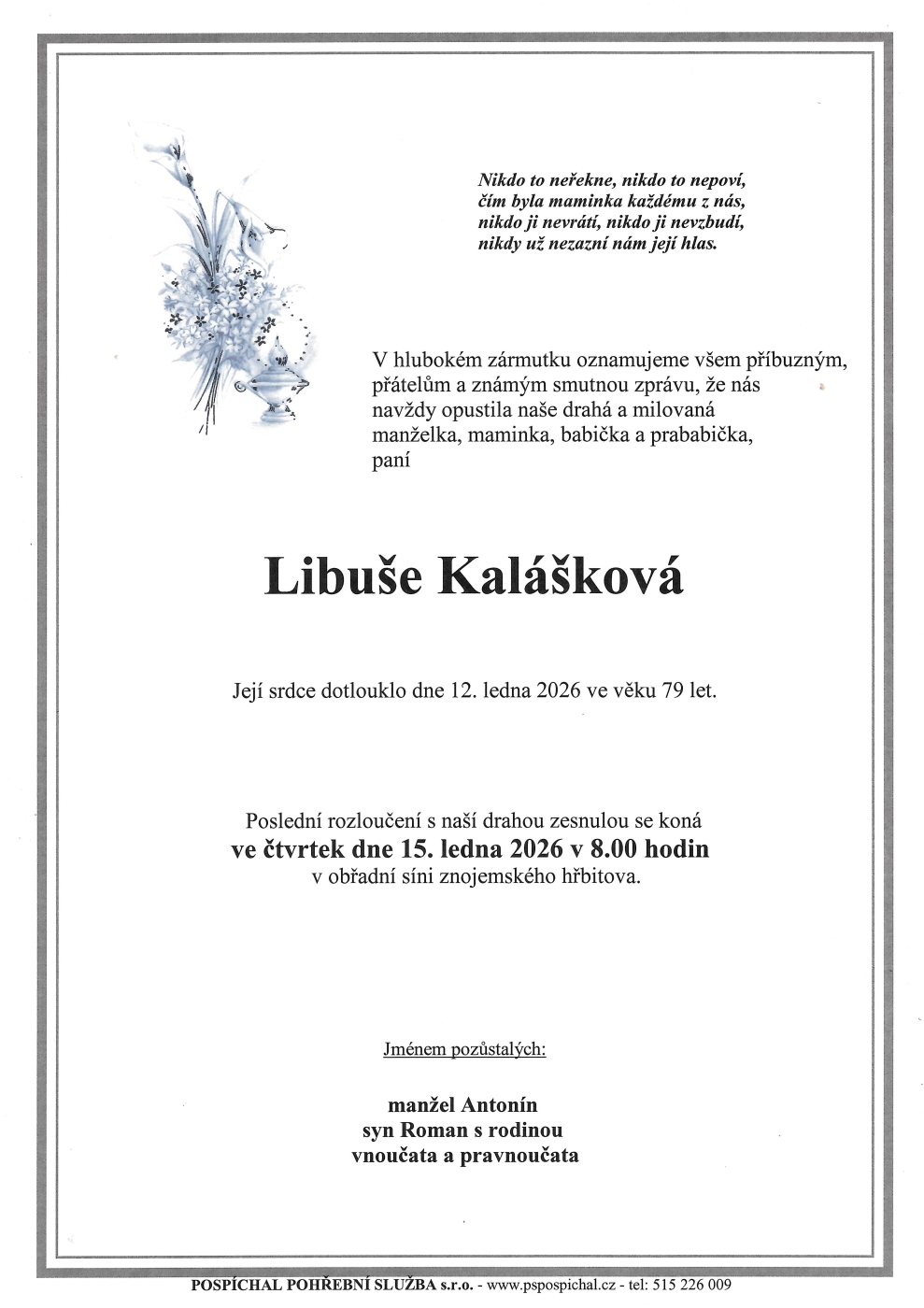 Rádi bychom poděkovali všem, kdo jste se přišli naposledy rozloučit s paní Libuší Kaláškovou.