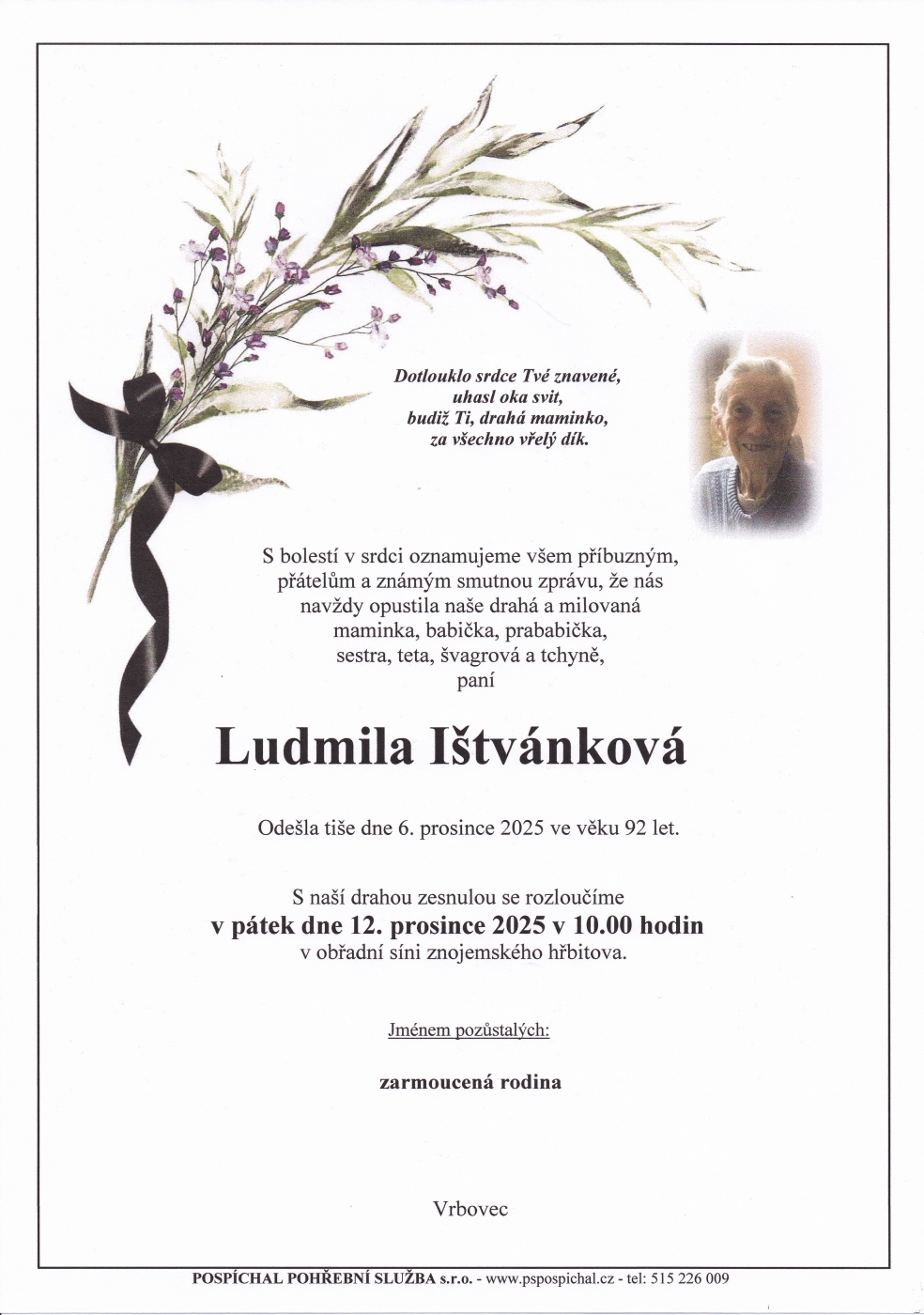 Děkujeme všem příbuzným, přátelům a známým, kteří se přišli naposledy rozloučit s paní Ludmilou Ištvánkovou.