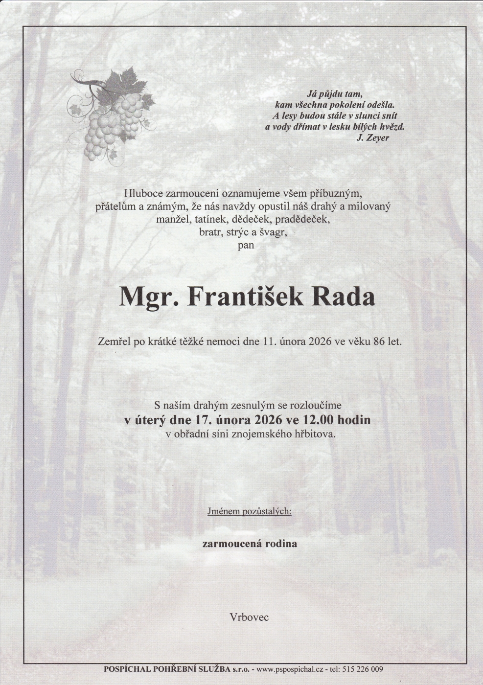 Děkujeme touto cestou všem příbuzným, přátelům a známým, kteří se přišli rozloučit s panem Mgr. Františkem Radou.