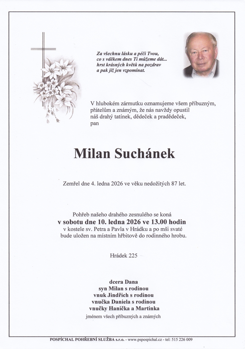 Děkujeme všem příbuzným, přátelům a známým, kteří přišli vyprovodit na poslední cestě pana Milana Suchánka.