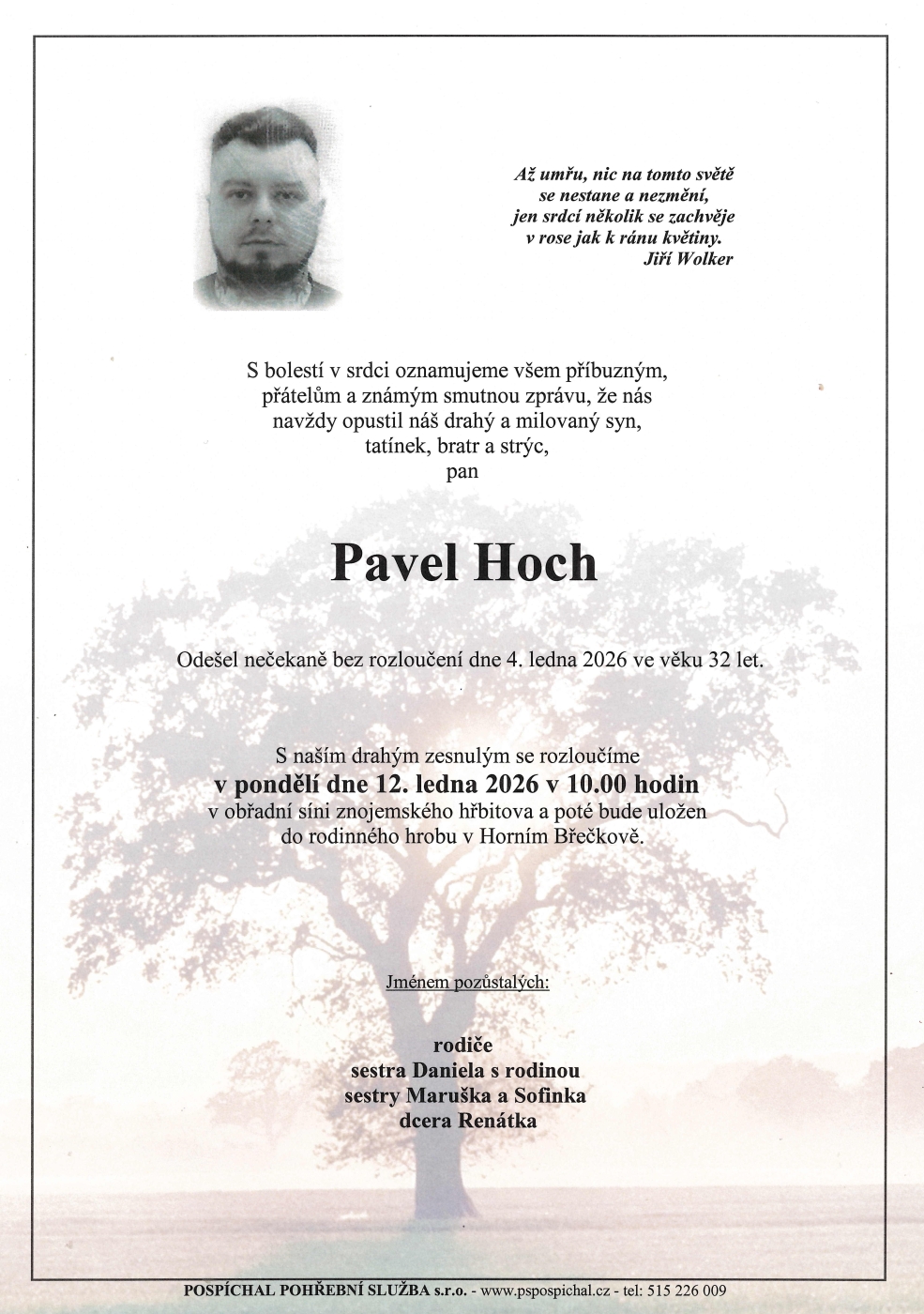 Děkujeme touto cestou všem, kdo jste se přišli naposledy rozloučit a vyprovodit na poslední cestě pana Pavla Hocha.