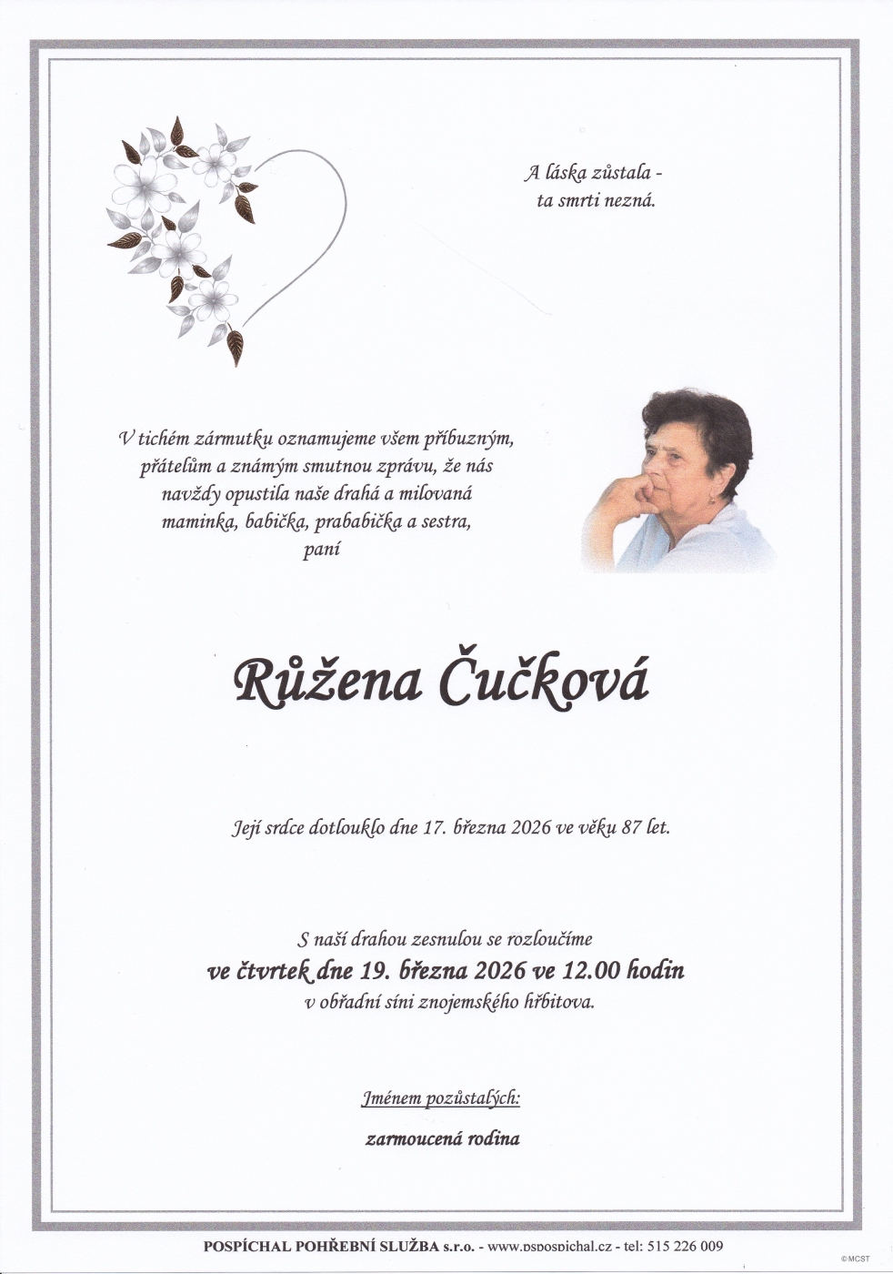 Rádi bychom poděkovali všem, kdo jste se přišli naposledy rozloučit s paní Růženou Čučkovou.